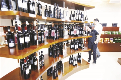 圖為新區(qū)進(jìn)口商品超市中琳瑯滿(mǎn)目的進(jìn)口紅酒 記者 賈磊 攝