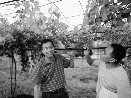 ▲盧江(左一)在田間考察圓葉葡萄生長情況