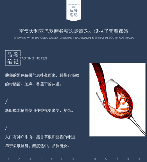 香氣 : 帶有黑醋栗、桑果與巧克力的香氣和橡木味