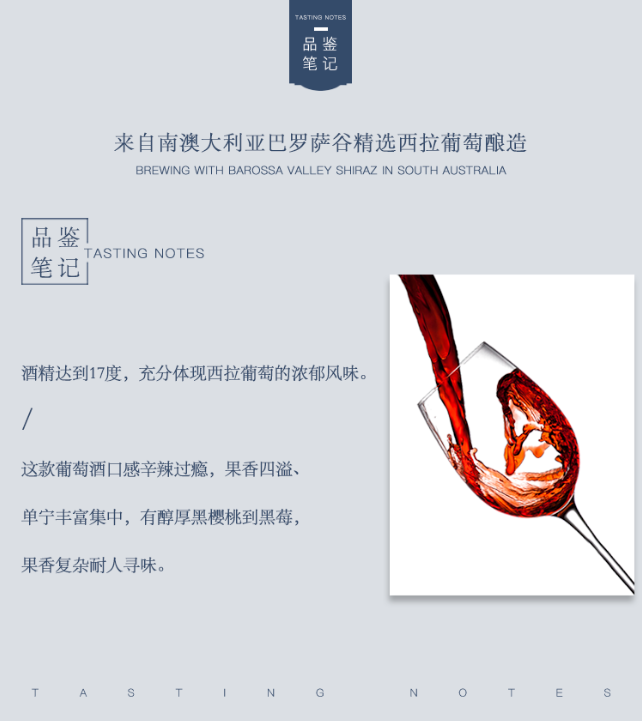 食物搭配 : 此酒與紅肉是完美的組合,也可以搭配其他燒烤類食物