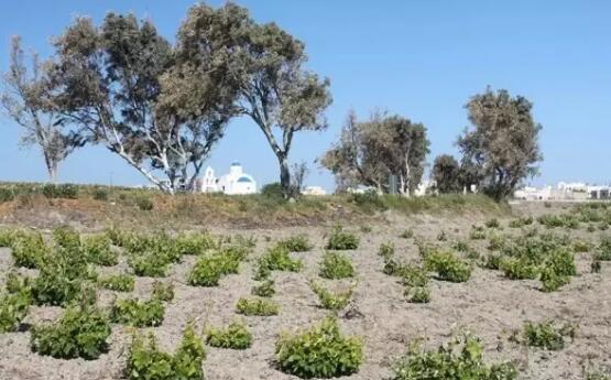 雖然這里是度假天堂,但是人們在這里盡情享受島上資源時,有誰能想到這里其實惡劣的自然條件?島上幾乎沒有水源,直到90 年代,島上的居民用水主要靠收集降水,甚至進口?,F在,雖然島上裝備了一個海水淡化廠,但用水還是相當緊張,只可供島上人們日常生活所用,而用于葡萄園灌溉的更是少之又少。我們在島上用于洗漱的水,只經過簡單的過濾,在口里還散發濃濃的海腥味。而且海島上的風也相當大,降雨量極少。在這樣的環境下,葡萄的種植相當不易,如果不灌溉,很少有葡萄品種能夠成活。但幸運的是,當地仍有少數幾種能夠僅靠吸取海風帶來的濕氣而堅強生長的葡萄品種,如Assyrtiko。