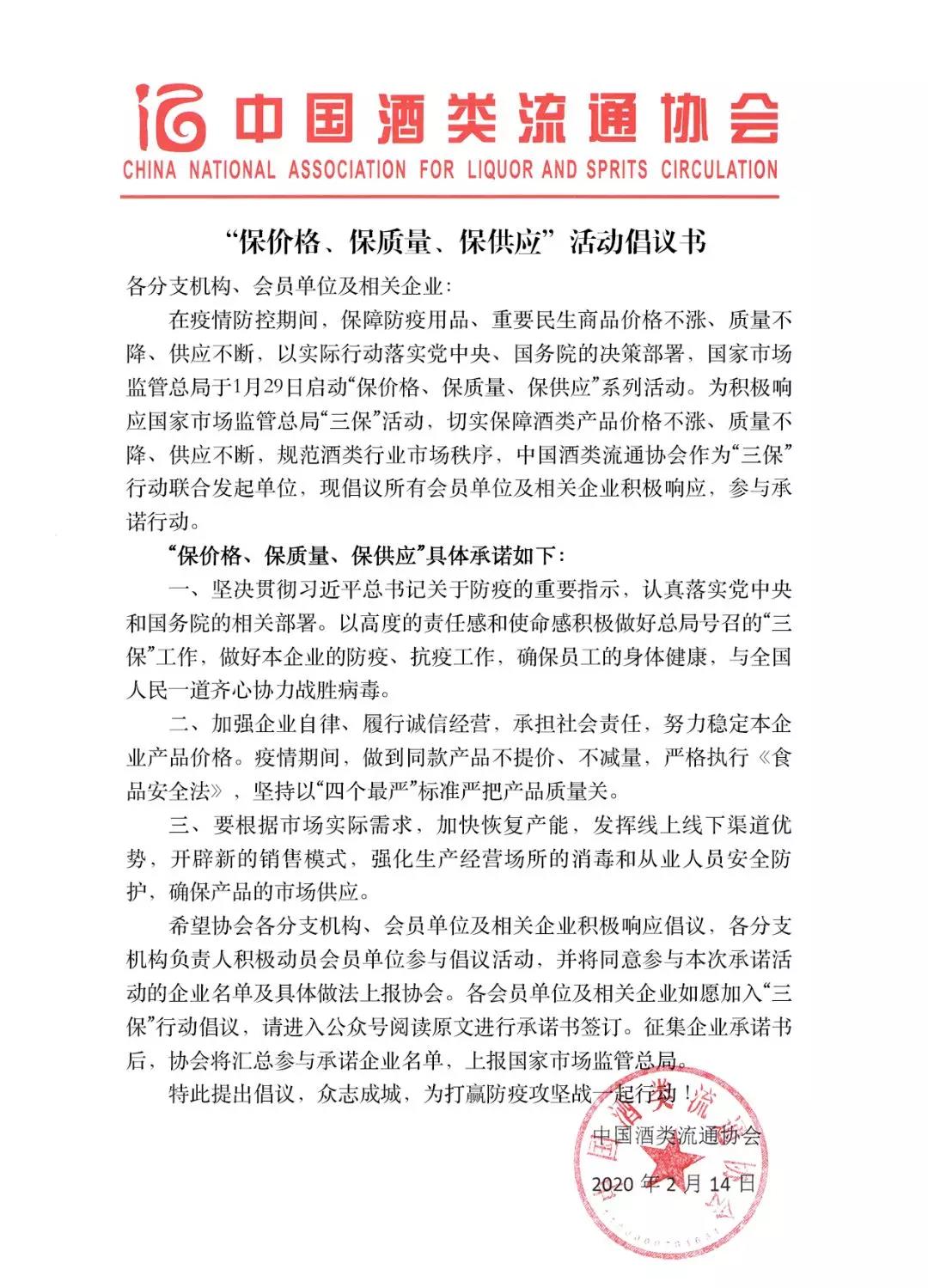 報(bào)名參加“三保”酒類(lèi)企業(yè)承諾,將以高度的責(zé)任感和使命感積極做好總局號(hào)召的“三保”工作,做好本企業(yè)的防疫、抗疫工作,確保員工的身體健康,承諾切實(shí)保障酒類(lèi)產(chǎn)品價(jià)格不漲、質(zhì)量不降、供應(yīng)不斷,規(guī)范酒類(lèi)行業(yè)市場(chǎng)秩序。