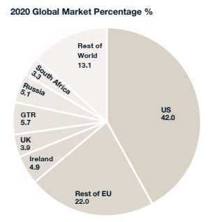 目前愛爾蘭威士忌在全球140個市場銷售(各地市場所占份額見下圖),其中美國是******的海外市場。2019年和2020年分別出口美國500萬箱,約占總銷量的43%,占所有輸美食品和飲料價值的46.8%。從2010年到2019年,愛爾蘭威士忌在美銷量增長了266%,美國市場占過去十年愛爾蘭威士忌銷量增幅的51%,未來10年,愛爾蘭威士忌在美國的銷量可能超過蘇格蘭威士忌。
