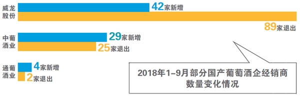 中信國(guó)安葡萄酒業(yè)股份在2018年1-9月新增經(jīng)銷商29家,退出經(jīng)銷商25家,較2017年年末微增4家。此外,中信國(guó)安葡萄酒業(yè)股份包含團(tuán)購(gòu)在內(nèi)的直銷渠道銷售收入下跌了43.42%,批發(fā)代理及經(jīng)銷商渠道的銷售收入則下跌了9.57%;通化葡萄酒股份的表現(xiàn)同樣不容樂(lè)觀,年末經(jīng)銷商數(shù)量較2017年年末僅增加兩家,而從銷售收入上看,含團(tuán)購(gòu)的直銷渠道銷售收入大幅下滑38.05%,批發(fā)代理渠道銷售收入則大幅下滑30.79%。